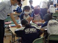 買い物という身近な場面を想定した連立方程式の授業でした。生徒は班員と相談しながら、問題解決に向かって真剣に取り組んでいました。