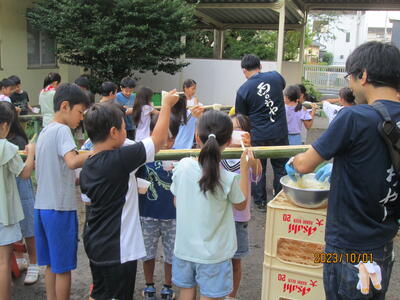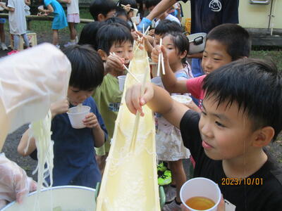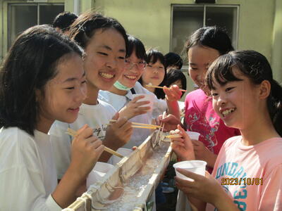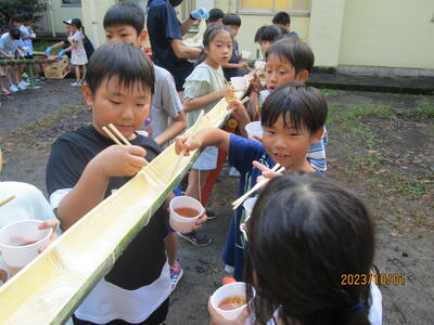 朝食はおやじ特製「流しそうめん」です。流れてくるめんやフルーツをねらって、みんなおいしそうにたくさん食べています!