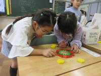 天候不順のため、校外学習が延期になったので、教室でどんぐり迷路を作りました。グループで考えを出し合い試しながら作った迷路には、落とし穴などのしかけがたくさん!どんぐり迷路屋さんを開いて友達と楽しみました。お昼はお家の方が作ってくださったお弁当を食べました。おいしいお弁当に笑顔いっぱいの1年生でした。