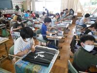 運動会に向けて、5年生が旗を作っていました。自分のお気に入りの文字をデザインし、黒い布にアクリル絵の具でかいていきます。自分の名前の文字や、「絆」「輝」「協」など、運動会で目指したいことをイメージしてデザインしていました。とてもかっこいい旗ができあがりそうです。