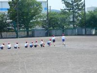 6年1組、体育の授業の様子です。「スタート」の合図で、両端から中央にあるコーンを目指してスタートします。相手より早くコーンにタッチするために、思いっきりダッシュします。これは運動会の練習にもつながりますね。
