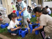 2年生が生活科で一人一鉢ずつ野菜を育てます。1年生の時に使った植木鉢に、自分が育てる野菜を植えました。