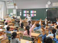 1年生が国語の学習をしています。教科書を見ながら先生が「なにがいますか。」「なにがありますか。」と投げかけると、みんな「はい!」と元気よく手を挙げています。