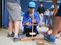 郷土資料館の見学が終わると、屋外で火起こしの体験です。写真は2組の火起こしの様子です。どの子もなんとか火を起こそうと真剣にやっていましたが、これが難しく、あと一歩の所まで行くのですがなかなか火が点きません。