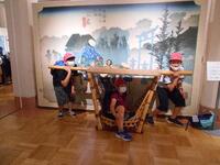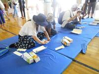 写真中央は牛乳パックでスプーンを作っているコーナー、右の写真はみんなでナマズ(けが人や病人)を運ぶ体験をしているところです。
