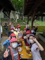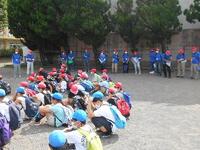 2日(土)の午後、PTA育成部主催の「あつまれ!西の子の森!~サバイバルマスター編~」が行われました。体育館で開会式を行った後、子供たちは地区ごとに「かけこみ110番の家」をさがして挨拶をするウォークラリーに出発です。この日はなんと、みしまるくんとみしまるこちゃんも来てくれました。