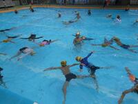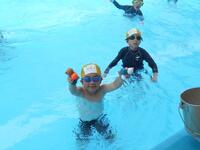 プールの中に入って少しずつ体を水に慣らしたあとは、「いいゆだなぁ~」と肩までつかったり、プールの端から端まで走ってみたりと、楽しさ満載です!あっという間の45分間。みんなもっともっとプールに入っていたかったようでした。