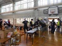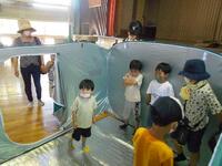 体育館のフロアでは、避難所となったときのパーテーションを組み立ててみました。中に入った子供たちは、はじめは「中は広いなぁ」と言っていましたが、「この中で何日も家族全員で過ごすことになるかも」と話すと、「え~っ!?じゃあこれだとちょっと狭いかもな~」とイメージを膨らませていました。