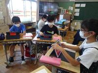 もうすぐ7月です。1年生が図工の時間に、七夕飾りを作りました。2色の色紙を三角形に切り、のりでていねいに貼り合わせていきます。