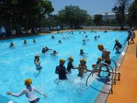 今日の午前中は、プールに入るのには絶好のお天気でした。3時間目に1年生が2回目の水遊びを行いました。水の中でウサギみたいに跳ねながら歩いたり、みんなでプールの壁に沿って歩いて流れるプールを作ったり…。あっという間の45分間でした。