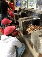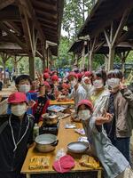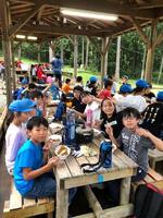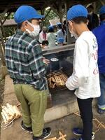 調理チームと火起こしチームに分かれ、効率よくカレーを作ります。隠し味はハチミツです!