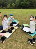 2組は芝生広場で思い出短歌を作っています。