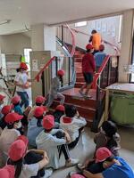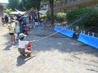体育館の外では水消火器体験や火起こし体験、プールの水を使って放水の体験も行いました。