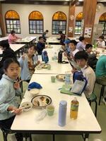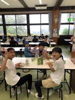 朝のつどいが終わり、朝食です。おいしそうに食べています。2組の様子です。