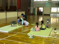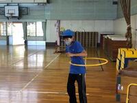 体育館では、カエル逆立ちとフラフープです。それぞれ、何秒続けられるかにチャレンジしていました。