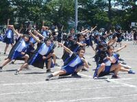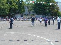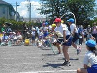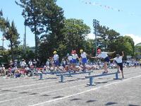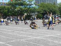 プログラム10番、3年生の団体競技「力を合わせてグルグル回せ!~台風の目~」です。コーンをぐるりと回るときに竹の端に4人が近づいたり、みんなの頭の上を竹が通るときには、待っている子がサッと姿勢を低くしたりと、勝つために作戦や工夫をして練習してきたことがよくわかりました。迫力のある「台風」でしたね!