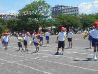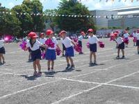 プログラム6番、1年生の「チェッコリたまいれ」です。「チェッコリ」のリズムに乗って元気よく踊り、笛の合図でかごにむかって玉を入れます。かわいい踊りと力いっぱいの玉入れ。みんな楽しそうです。