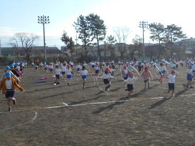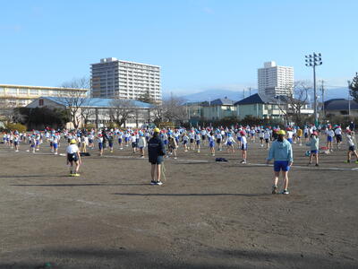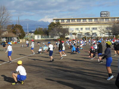 今日は今年度最後の朝運動です。雪化粧をした富士山をバックに、みんなリズミカルに跳んでいます。