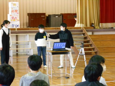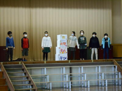 5時間目に、読み聞かせボランティア「ブックママン」のみなさまによる朗読劇があり、6年生が鑑賞しました。これは卒業していく6年生のために、毎年この時期に行ってくださっているものです。昨年度はコロナウイルスの影響によりライブ配信となってしまいましたが、今年度は第2音楽室で6年生に見てもらうことができました。