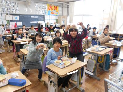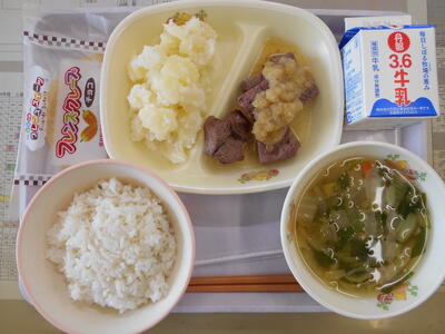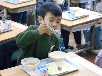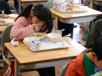 今日の給食はなんとサイコロステーキとクレープです!写真は1年生と5年生の様子です。みんなおいしそうに、たくさん食べています。