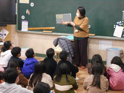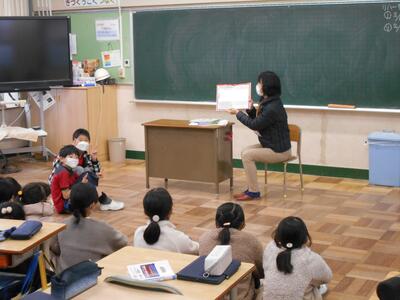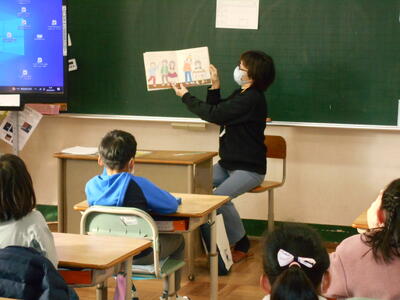 今日はブックママンさんの読み聞かせの日です。今回は1~3年生の教室で読み聞かせをしてくださいました。電子黒板を活用したり、大型絵本を用意してくださったりと、子供たちがお話の世界に入りやすいようにいろいろと工夫してくださいました。
