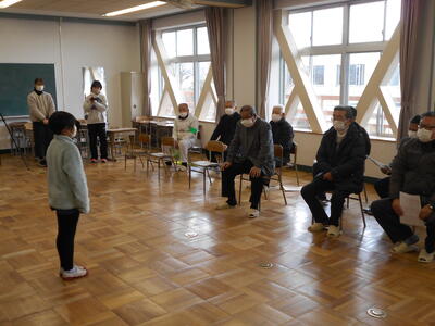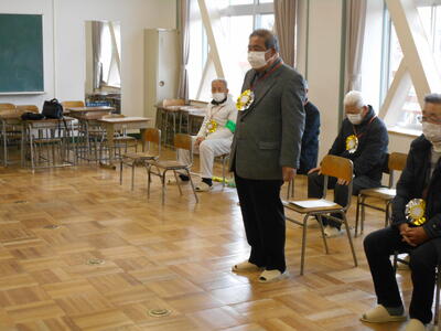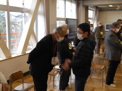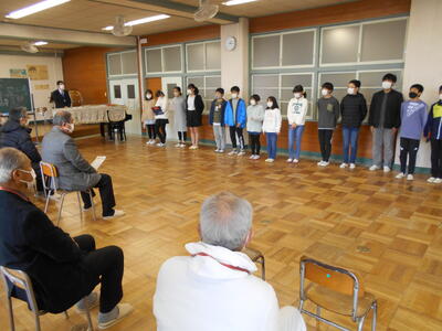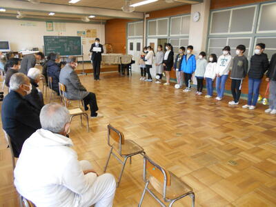 つづいて、全校児童を代表して、あいさつ委員からお礼のメッセージが書かれたメダルと、心のこもった歌「ありがとう」のプレゼントです。スクールガードの皆様も、とても喜んでくださいました。