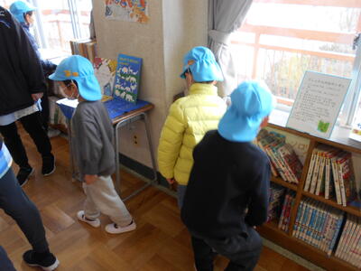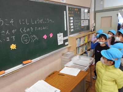 今日の午前中、西小学校の近くにある幼稚園、保育園から、来年度の1年生が見学にやってきました。音楽室や学校図書館に入ったり、お兄さん、お姉さんが勉強している教室の中に入らせてもらったりと、西小学校を体感しました。1年生の教室に入ると、黒板に「ようこそ にししょうがっこうへ みなさんがくるのを たのしみにまっています」と書かれていました。