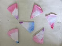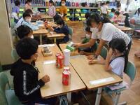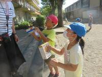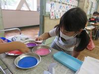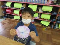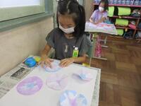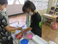お世話をしてきたあさがおの絵を、大きな画用紙に描くことにしました。あさがおの花は「にじみ絵」で咲かせます。折りたたんだ和紙に絵の具をちょんちょん。みるみる染まっていく様子に興味津々です。どんな花が咲くのかな?開花が楽しみです。
