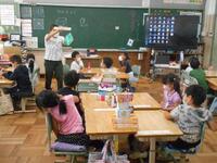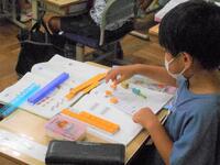 2時間目に、1年生が算数「かたち」の学習をしていました。いろいろな形の箱を「しかくかくかく(直方体)」、「さいころ(立方体)」、「つつ・ほそまる(円柱)」の三つのグループに分けていきます。みんな上手に分けていましたが、ラップの箱は細くて長いから「ほそまる(円柱)」なのか、それともかくかくだから「しかくかくかく(直方体)」なのか、考えてしまいました。みんなで考えて、太さや長さは違っても、コロコロと転がらないから「しかくかくかく(直方体)」の仲間だということが分かりました。