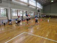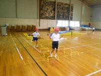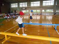 1年生が体育の学習で跳んだり跳ねたりくぐったりと、楽しそうなサーキットをしていました。スタートしたら自分の腕の力でステージによじ登り、マットの上に飛び降ります。ネットをくぐった後は落ちないように平均台を渡ります。マットの坂道を越え、ミニハードルを跳び越し、最後はボールをかごに入れてゴールです。みんな夢中になっていました。