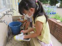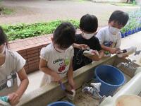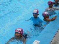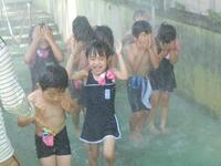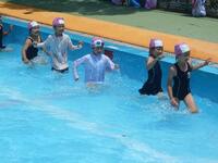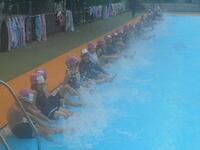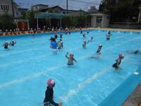 今日の午前中は、プールに入るのには絶好のお天気でした。3時間目に1年生が2回目の水遊びを行いました。水の中でウサギみたいに跳ねながら歩いたり、みんなでプールの壁に沿って歩いて流れるプールを作ったり…。あっという間の45分間でした。