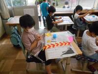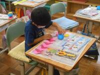 もうすぐ7月です。1年生が図工の時間に、七夕飾りを作りました。2色の色紙を三角形に切り、のりでていねいに貼り合わせていきます。