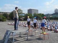 校長先生から優勝旗と賞状を授与されるときの確認です。各組の団長さんと副団長さんが出てきて、もらい方を練習しました。当日はどの久美が優勝するのか、楽しみですね。児童会長さんによる終わりの言葉もしっかりできました。