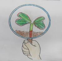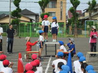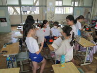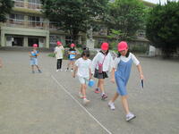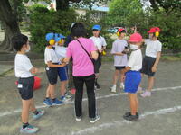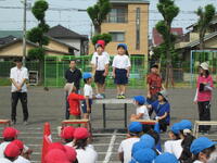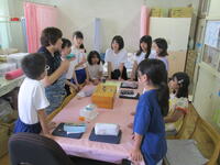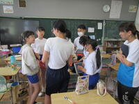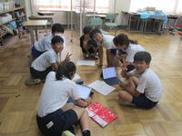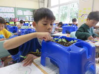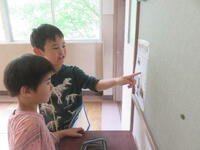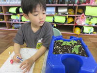 種まきをしたあさがおが、一週間ほどで芽を出しました。「ハートみたいな形だね。」「根っこの方が赤いよ!」など、形や色について発見したことを発表しました。観察カードを書く学習では、見るだけでなく実際に触って感じたことを描く子もいました。これから9月ごろまで、お世話と観察をしていきます。