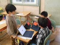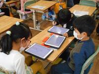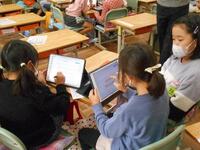 1年生が国語の学習で、タブレットを使ってクイズ大会をしていました。ヒントを難しい順に三つ考え、おともだちに出題します。メタモジの「めくり」という機能を使って、みんなにこにこしながら問題を作っていました。