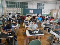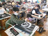 運動会に向けて、5年生が旗を作っていました。自分のお気に入りの文字をデザインし、黒い布にアクリル絵の具でかいていきます。自分の名前の文字や、「絆」「輝」「協」など、運動会で目指したいことをイメージしてデザインしていました。とてもかっこいい旗ができあがりそうです。