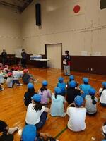 入所式で、所員の方の話を真剣に聞く、5年生。