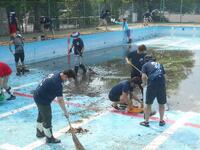 4日(土)の午前、PTA育成部(おやじの会)の皆様がプール清掃をしてくださいました。貴重なお休みの日にもかかわらず、約30人のおやじの方々が集まってくださいました。プールの中にはかなりの量の落ち葉があったので、まずは落ち葉を取り除き、高圧洗浄機やデッキブラシで汚れを落としていきます。