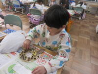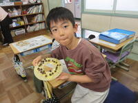 「どんぐり、どこに置こうかな?」「イチョウの落ち葉は、どんな向きにしようかな?」「葉っぱの上にどんぐりを置いてみよう!」「まつぼっくり、私も飾ってみよう!」「その黄色い葉っぱ、いいね!」世界にひとつだけのすてきなリースが完成しました。