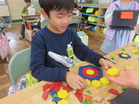 パターンブロックをいっぱい使って作りました。敷きつめて模様を作ったり、積み上げて形を作ったり、自分で作ったり、友達と協力して作ったたり……。1年生の豊かな感性を見ることができました。