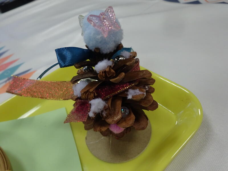 松ぼっくりを素敵な飾りでデコレーションした、クリスマスツリーです。