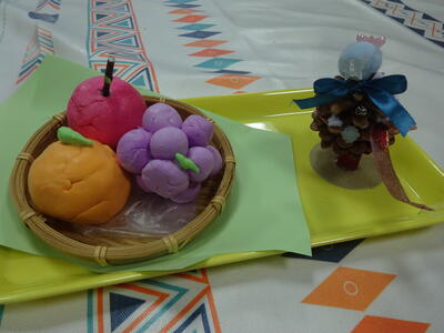 秋に届いたおいしそうなフルーツと並べて飾りました。