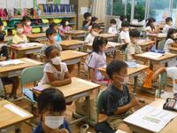 生活科の「なつが やってきた」の学習で水鉄砲をしました。初めに中庭のいちょうやひまわりの葉っぱに的当てをしましたが、なかなか葉っぱに当たりません。さあ、どうしたらいいかな? …しばらくすると、「振ってみたら当たったよ!」、「やってみよう!」、「強く押したらどうかな?」など、話をする声が聞こえてきました。勢いよく水を出す方法を発見した1年生。そのあとは思いきり水鉄砲合戦をしました。容器や着替え等の用意をありがとうございました。
