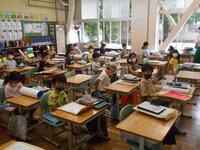 1年生が国語の時間にドリルで漢字の学習をしています。お手本を見て、先生のアドバイスをよく聞いて、真剣な表情でていねいに書いています。 この一生懸命な姿勢がかっこいいですね!