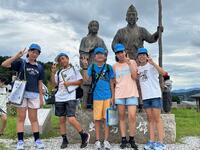 蛭ケ小島の銅像の前で記念写真を撮りました。かなり疲れも溜まってきていると思いますが、もうひとがんばり!