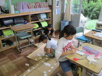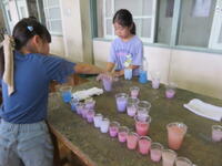 お世話をしてきた、あさがおの花で作りました。「花はピンク色なのに、いろみずは紫色になったよ!」「きらきらして宝石みたいだよ。」など、発見したことや思ったことを教えてくれました。