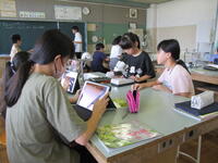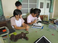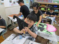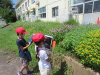 タブレットのカメラの機能を使って、校庭の様子を記録しました。夏花壇の前で「この花はブルーサルビアっていうんだって。」「ニチニチソウの花は赤色も白色もあるんだよ。」と写真を見せ合ったり、草むらで「虫がいたから写真を撮ろうとしたけど、逃げられちゃったよ。」「トンボがいるよ!」など伝え合ったりしながら、たっぷり1時間、活動しました。