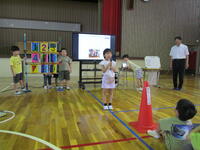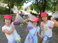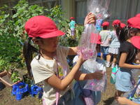 いろみずあそびをしました。キャップの裏に絵の具をちょんとつけて、水を入れたペットボトルを振ると……思わず飲みたくなってしまうようないろみずができました。友達と見合ったり、混ぜ合わせたりして楽しく活動しました。中には「赤色と青色を混ぜたら紫色になったよ!」「はじめは色が薄かったから、絵の具を足したら濃くなったよ。」など、発見したことを話に来る子もいました。