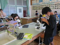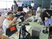 顕微鏡とタブレットを駆使して、あさがおの花粉を観察しました。