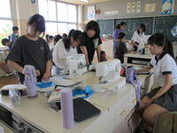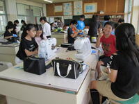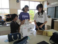 初めてのミシンということで、退職された先生方のお力を借りて指導しています。
